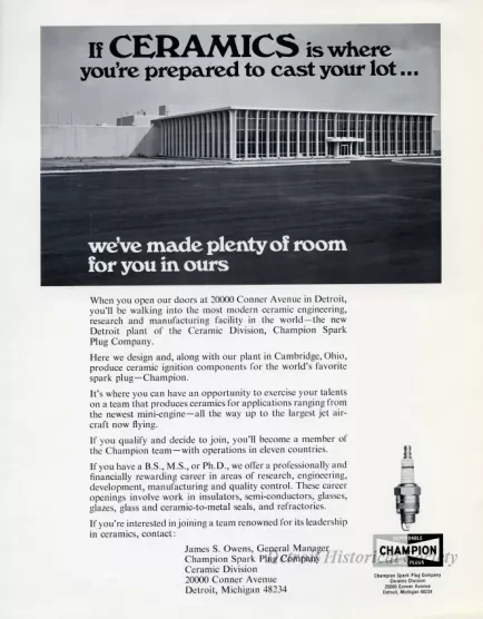 Black and white advertisement for employment at the Champion Spark Plug Co., showing an image of the Ceramics Division facility. It reads, "If ceramics is where you're prepared to cast your lot we've made plenty of room for you in ours".
