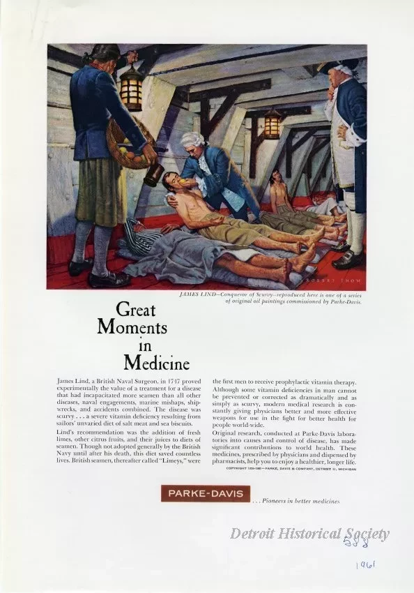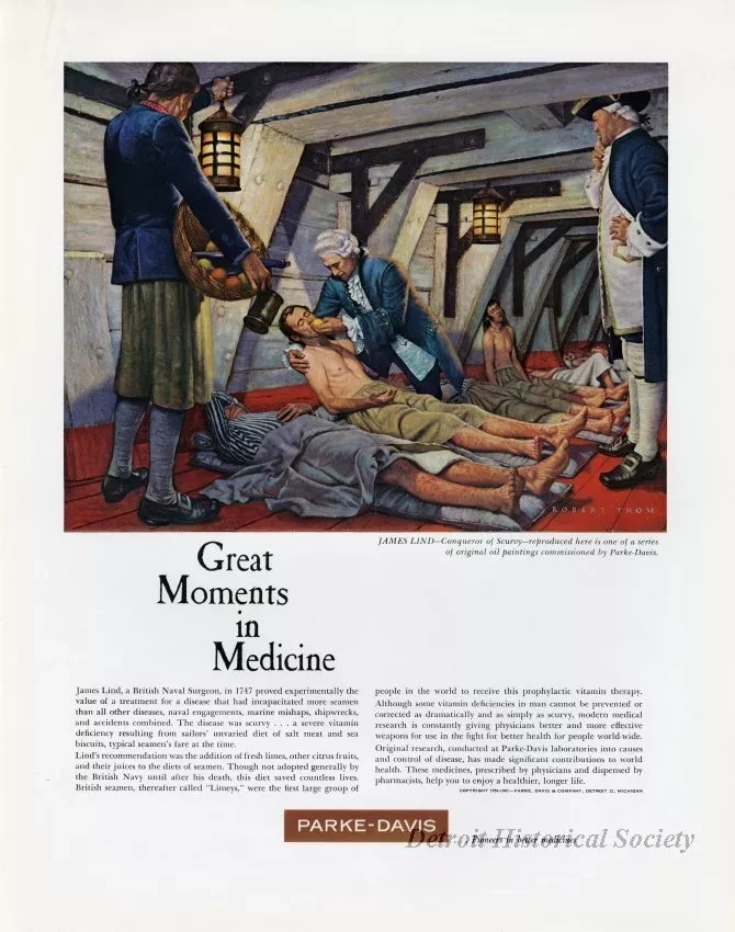 Color print advertisements for Parke-Davis. Part of the "Great Moments in Medicine" series of paintings by Robert Thom. It depicts James Lind treating a British sailor for scurvy.