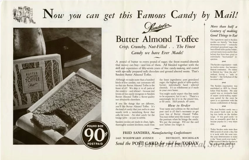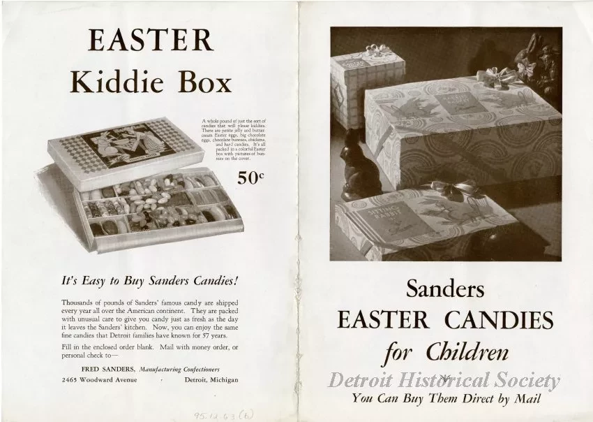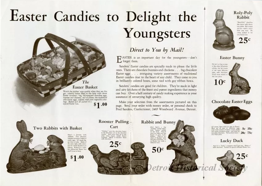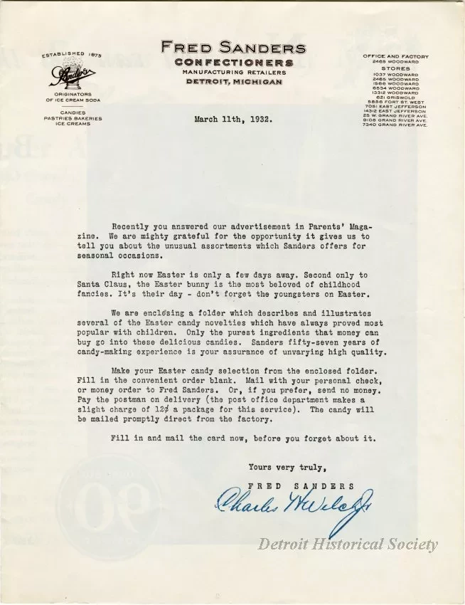 Half-folded Fred Sanders Confectioners advertising mailer dated March 11, 1932, containing a smaller half-folded advertisement for the company's Easter candies, available through mail order. A letter from Fred Sanders and Charles H. Welch Jr. about the company's Easter offerings is printed on the cover of the outer flyer. An advertisement for Sanders Butter Almond Toffee is printed within. The inner advertisement features candy-filled Easter baskets; chocolate rabbits, bunnies, ducks, and roosters; and a box of chocolates, jelly beans, and hard candies.
