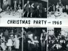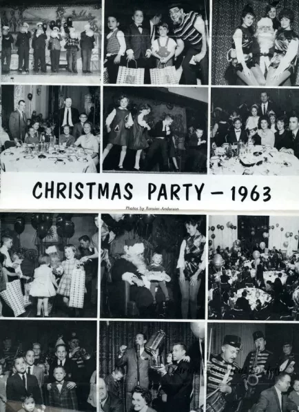 One advertisement page with twelve black and white photographic images. Printed text at the center of the page reads "Christmas Party - 1963, Photos by Ransier-Anderson." The images show festivities of a holiday party including children sitting on Santa's lap, families seated around tables, and Toby David as Captain Jolly posing with children.