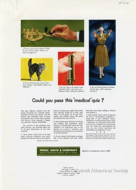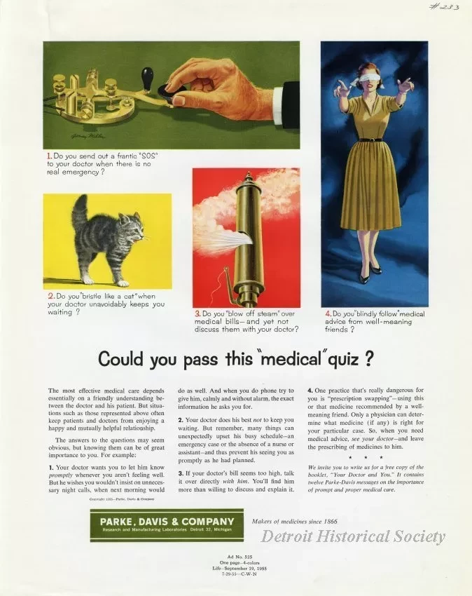 Color print advertisements for Parke, Davis & Co. about maintaining a good doctor-patient relationship. It depicts a cat, steam whistle, blindfolded woman, and a Morse code key.