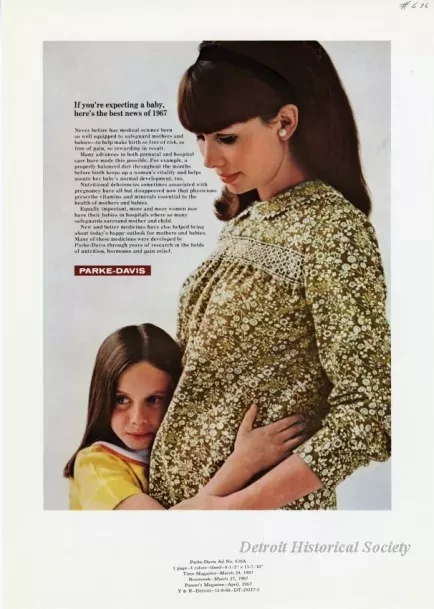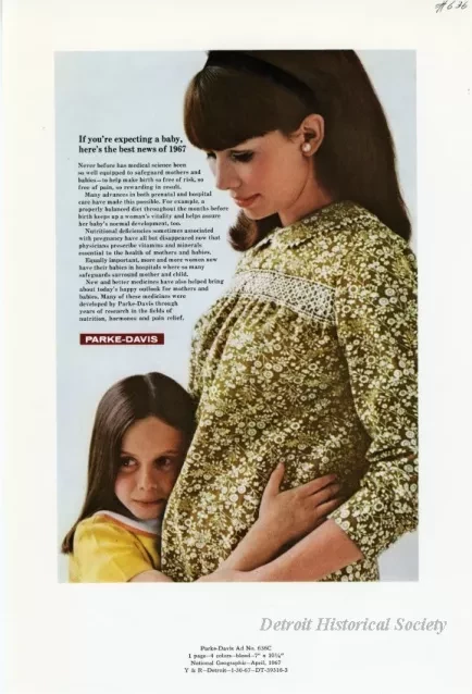 Color print advertisements for Parke-Davis concerning prenatal care. It depicts a girl listening to the abdomen of her pregnant mother.
