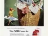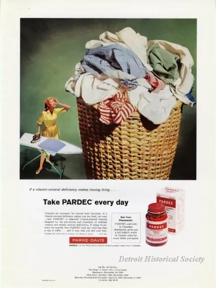 Color print advertisements for Pardec, a multivitamin produced by Parke-Davis. It depicts a woman ironing next to an oversize basket of laundry.