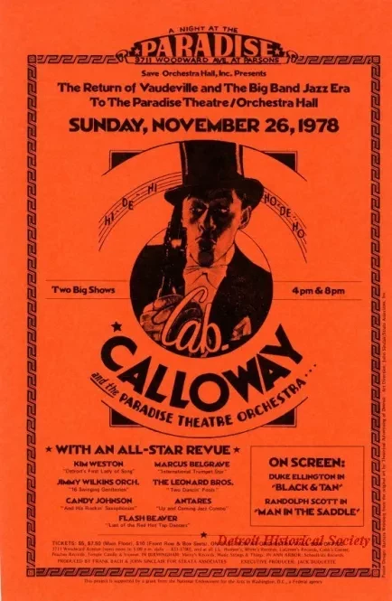 One advertisement card for the "Cab Calloway and the Paradise Theatre Orchestra" performances at Orchestra Hall in Detroit on November 26, 1978. It features Cab Calloway and the Paradise Theatre Orchestra "with an All-Star Revue" of Kim Weston, the Jimmy Wilkins Orchestra, Candy Johnson, Marcus Belgrave, the Leonard Brothers, Antares, and Flash Beaver, as well as the films "Black and Tan," and "Man in the Saddle," scheduled on November 26. The advertisement is printed in black text on pale red paper.