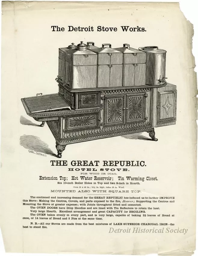 Advertisement from the Detroit Stove Works promoting their "Great Republic" model hotel stoves. On the recto is an illustration, credited to William E. Earl of Detroit, of a Great Republic stove and text advertising that it is "for Wood or Coal" and that "The continued and increasing demand for the Great Republic has induced us to further improve this Stove: Making the Centres, Covers, and parts exposed to the fire, Heavier; Supporting the Centres and Mounting the Stove at greater expense; with Joints throughout fitted and cemented. The Oven Doors have Drop Handles and are lined with Tin Reflectors to retain the heat. Very large Hearth. Excellent arrangement and great Capacity for Broiling. The Oven bakes evenly in every part, and is very large, capable of baking 22 loaves of Bread at once, or 14 loaves of Bread and 5 Pies at the same time. N.B. - All our stoves are made from the best mixtures of Lake Superior Charcoal Iron - the best to stand fire."