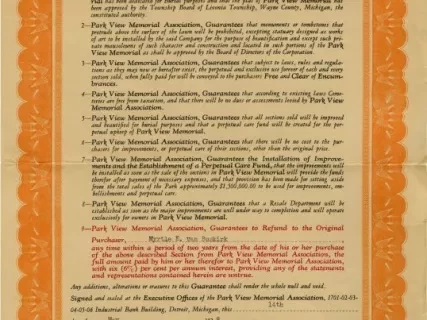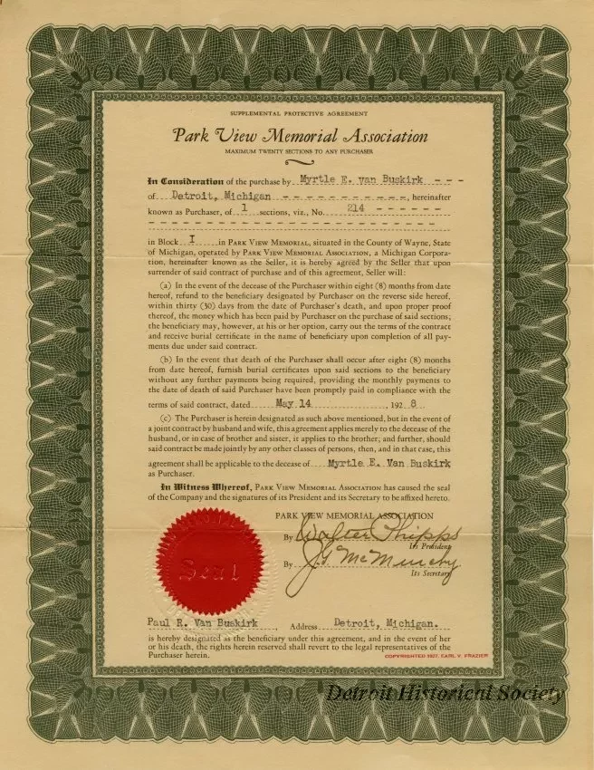 Supplemental protective agreement from the Park View Memorial Association to Myrtle E. Van Buskirk for her purchase of a cemetery plot. Dated May 14, 1928. The beneficiary is Paul R. Van Buskirk.