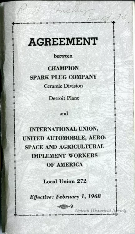 Staple-bound 163-page booklet containing Articles of the agreement between the Champion Spark Plug Co. and the UAW, with letters of understanding and an index.