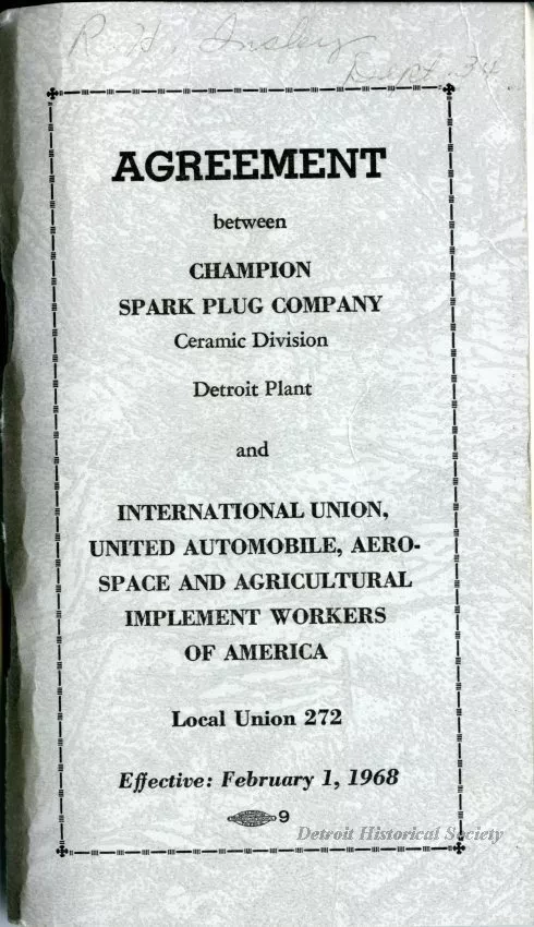 Agreement between Champion Spark Plug Company Ceramic Division Detroit Plant and International Union, United Automobile, Aerospace and Agricultural Implement Workers of America, Local Union 272; Effective: February 1, 1968