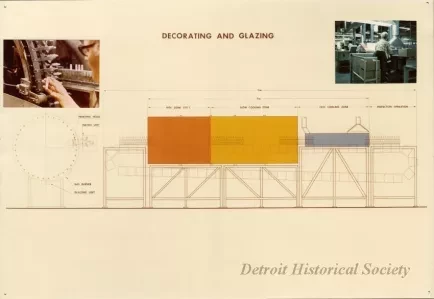 Request ImagePresentation display board charting the process decorating and glazing at the Champion Spark Plug Co. Ceramic Division, with two accompanying photographs.