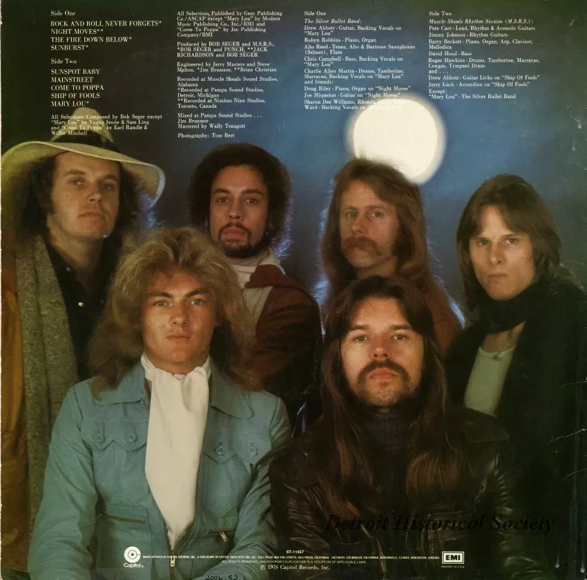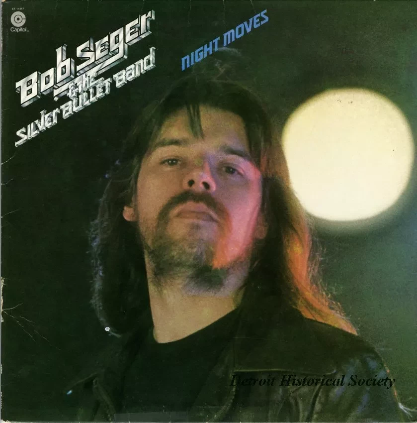 Bob Seger and the Silver Bullet Band LP "Night Moves," released by Capitol Records, featuring the title track, "Rock and Roll Never Forgets," and "Mainstreet." Bob Seger, clad in a leather jacket, is pictured on the cover against a dark backdrop in front of a light suggesting the moon. The entire band is similarly shown on the back. The inner record sleeve contains lyrics and a photo of Seger.