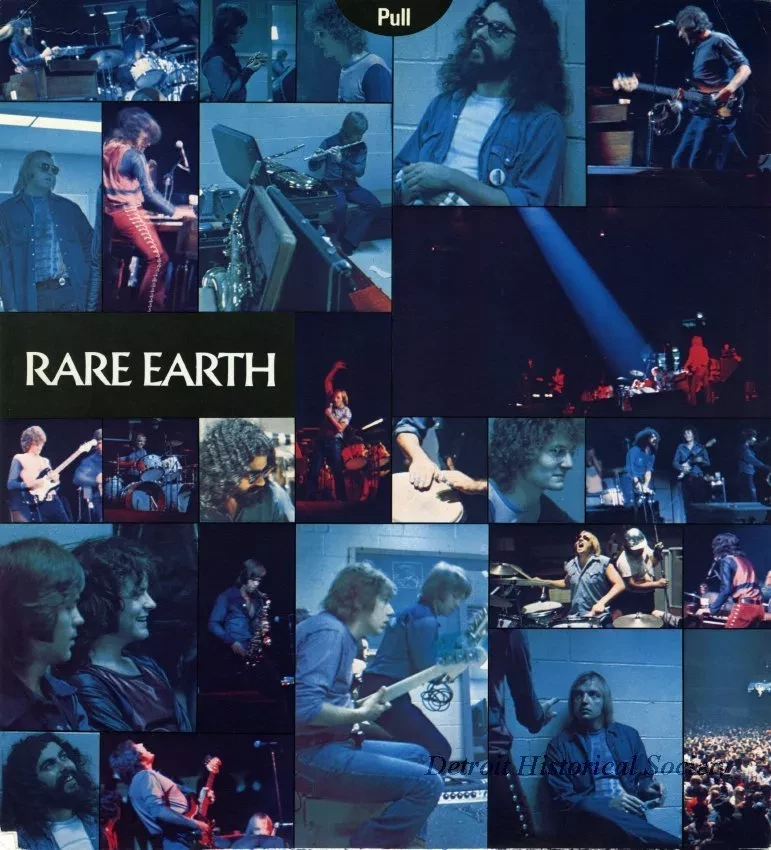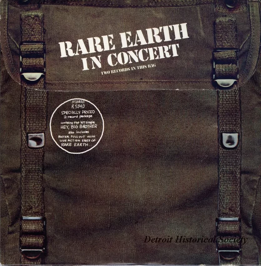 Rare Earth double-LP, "Rare Earth in Concert," released by Motown Records, 1971, and features the live recorded tracks, "Just Want to Celebrate;" "Hey, Big Brother;" "Born to Wander," "Get Ready," Ray Charles's, "What'd I Say," "Thoughts," "(I Know) I'm Losing You," and "Nice to Be With You." The front of the LP reads, "Rare Earth in Concert, Two Records in this Bag, Stereo, R534D, Specially Priced, 2-Record Package, contains the hit single, "Hey, Big Brother, also includes poster pull-out with live action shots of Rare Earth " Double-LP opens from the top, and features a pull-out poster collage of images of Rare Earth, which is adjacent to the sleeves which house the LPs. The sleeves feature a pictorial catalog of the Motown Record releases.