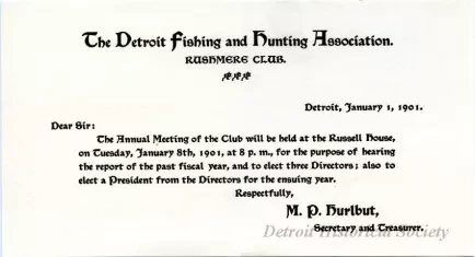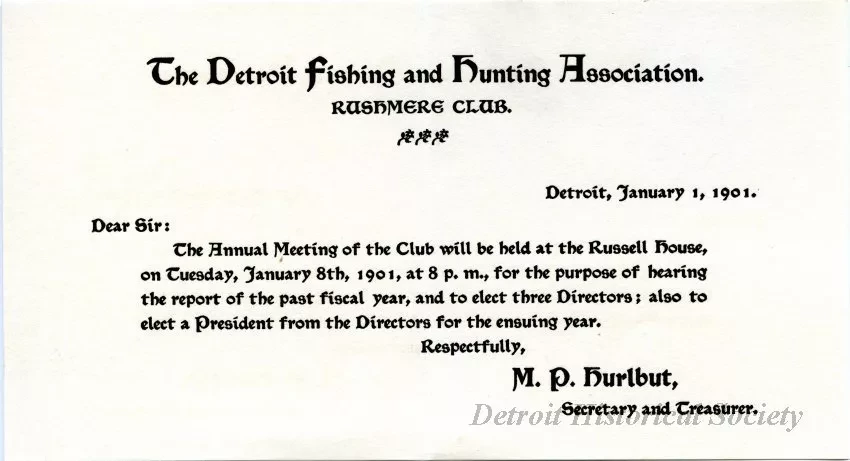 This announcement is from M. P. Hurlbut, Secretary and Treasurer of the "The Detroit Fishing and Hunting Association, Rushmere Club," to notify members of the club Annual Meeting on January 8, 1901, at the Russell House. The announcement is printed in black text on white paper.