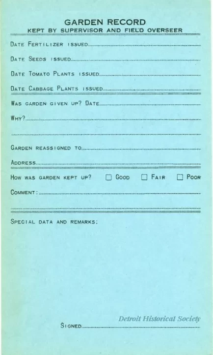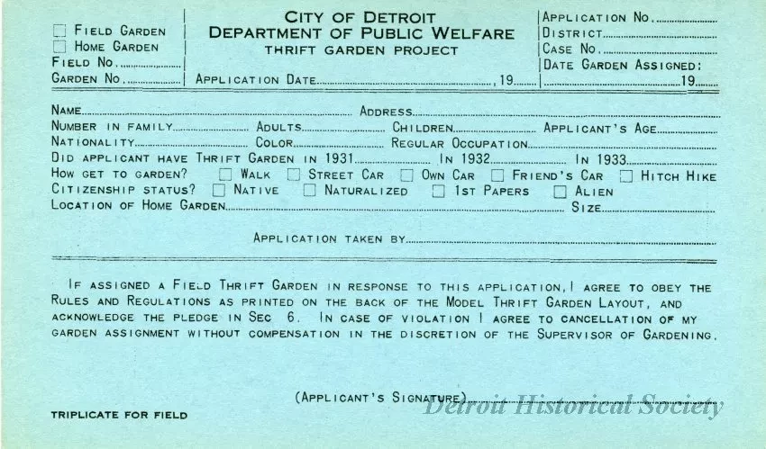 Blank application form for potential gardeners from the City of Detroit, Department of Public Welfare and the Thrift Garden Project. Questions include name, address, number of family members, nationality, skin color, occupation, previous involvement in a Detroit Thrift Garden, mode of transportation (hitch hiking is included as a possibility), and citizenship status. A record, concerning issued fertilizer, seeds, and plants, as well as the state of the garden, to be filled out by a supervisor and field overseer is on the verso. "Triplicate for field," is printed at the lower left corner of the recto, suggesting that this blue form was originally attached to two other forms.