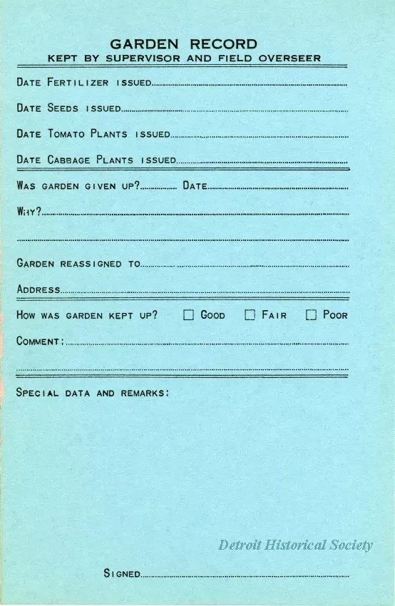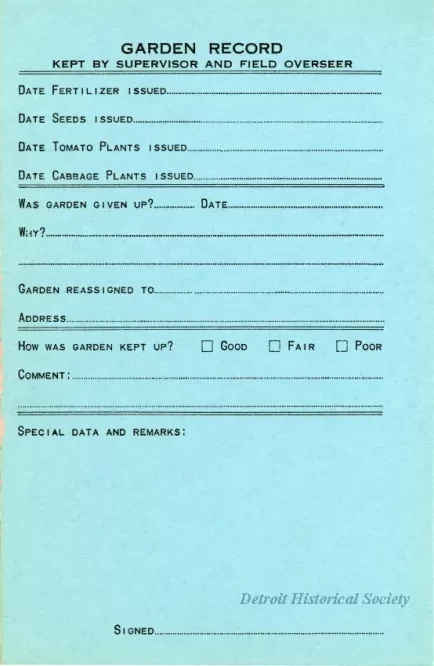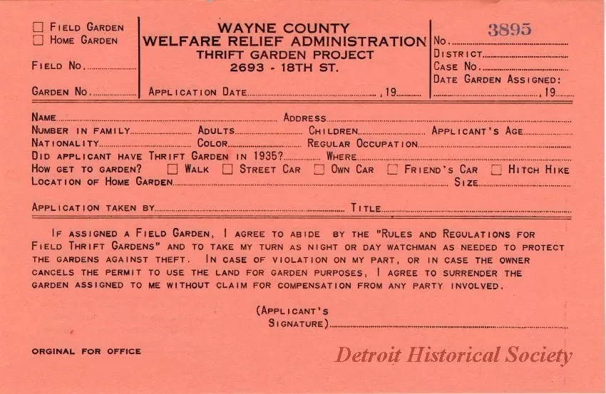 Blank application forms for potential gardeners from the Wayne Country Welfare Relief Administration and the Thrift Garden Project. The form is provided in triplicate, with a top salmon-colored "original for office," a white "duplicate for welfare district files, and a blue "triplicate for field." Questions include name, address, number of family members, nationality, skin color, occupation, previous involvement in a Detroit Thrift Garden, mode of transportation (hitch hiking is included as a possibility), and citizenship status. A record, concerning issued fertilizer, seeds, and plants, as well as the state of the garden, to be filled out by a supervisor and field overseer is on the verso of the blue form. There are two sets of the forms, one numbered 3895 and the other, 3896.