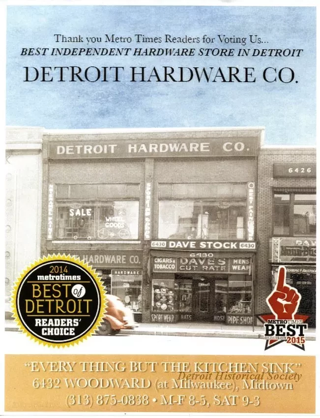 One award certificate given by Metro Times to the Detroit Hardware Company for being the "Best Independent Hardware Store in Detroit" in 2014. The multi-color certificate is printed in black and white text on white paper and shows a black and white photographic image of the front of the hardware store in the background.