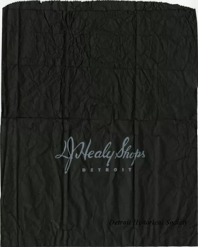 1 - D.J. Healy Shops flat paper shopping bag. The bag is black with "D.J. Healy Shops Detroit" printed on the recto, and a silver ribbon handle on the verso.