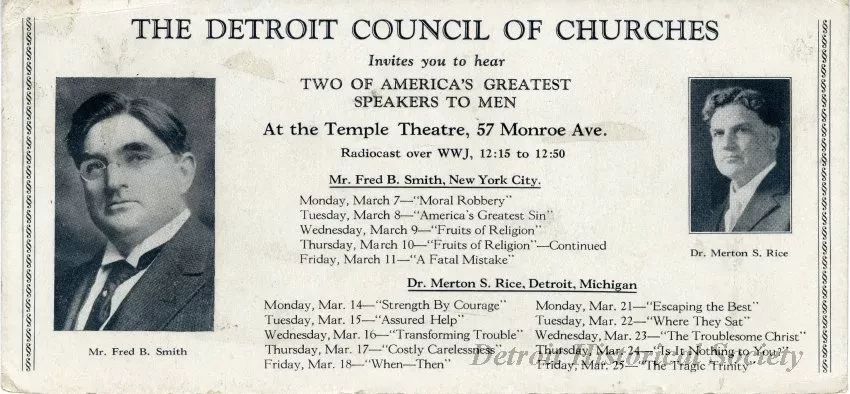 Ink blotter card advertising a series of sermons from Fred B. Smith of New York, and Dr. Merton S. Rice of Detroit, "two of America's greatest speakers to men," at the Temple Theatre at 57 Monroe Avenue, sponsored by the Detroit Council of Churches. The sermons are scheduled from March 7 to March 25. Both men are pictured on the blotter. The blotter mentions that the sermons are to be "radiocast" by WWJ.
