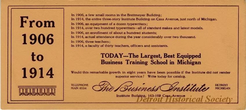 Ink blotter advertising The Business Institute by comparing the school's statistical improvement from 1906 to 1914.