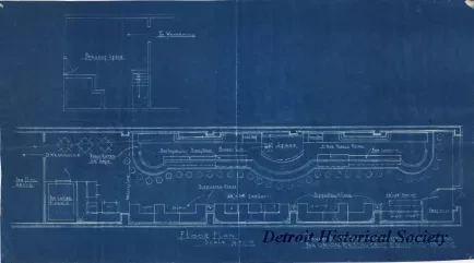 Drawing "s" is a sepia print that shows the floor plan of the Colonnade Cafeteria in the Farwell Building. The plan includes the complete layout of the kitchen, store room, snack bar, and dining areas. It was prepared at a scale of 1/4 inch = 1 foot and was dated October 2, 1958.