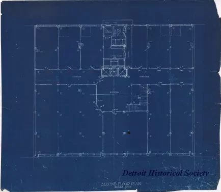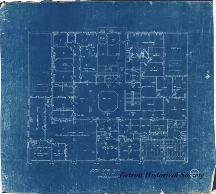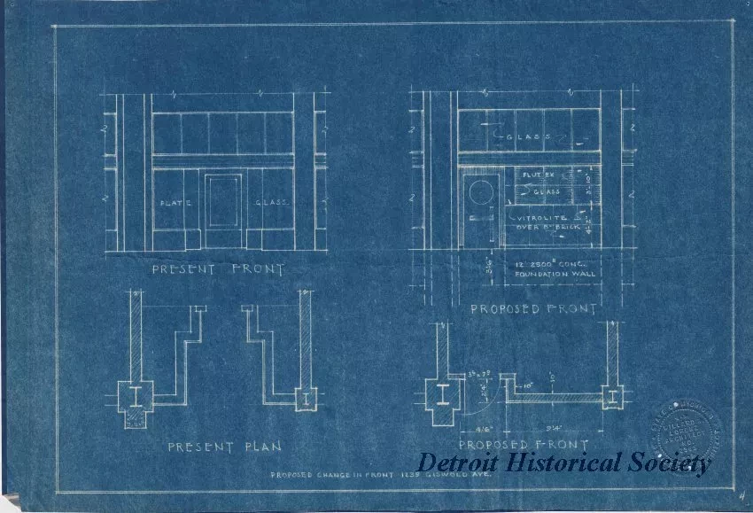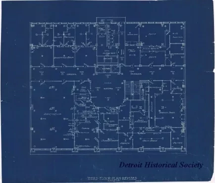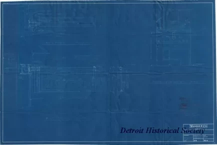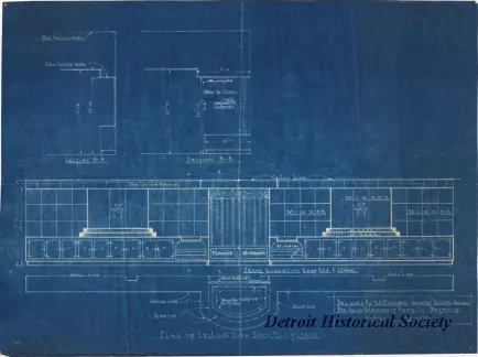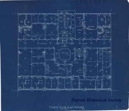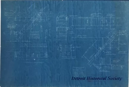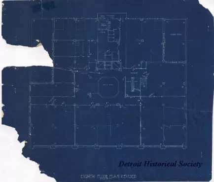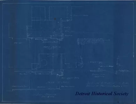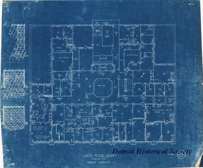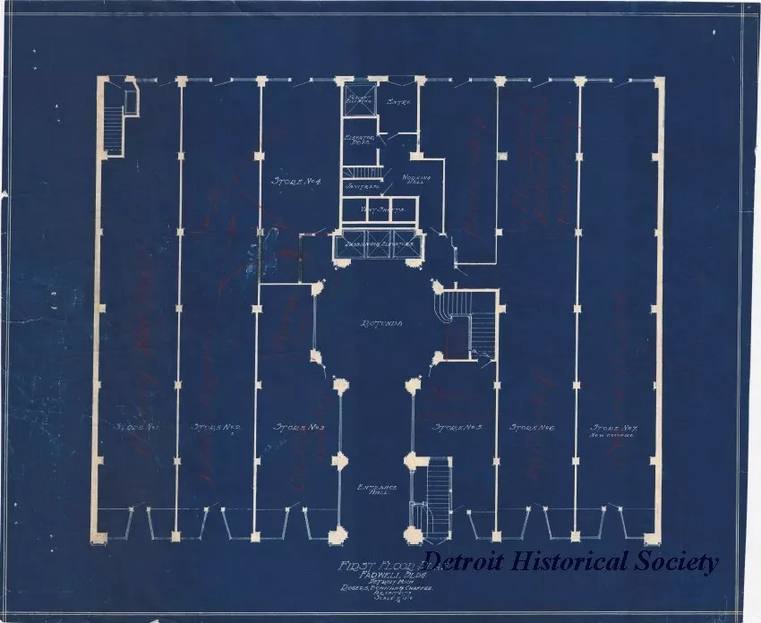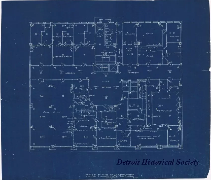 Blueprint drawings showing various views, floor plans, revisions, and proposed alterations to the Farwell Building in Detroit: