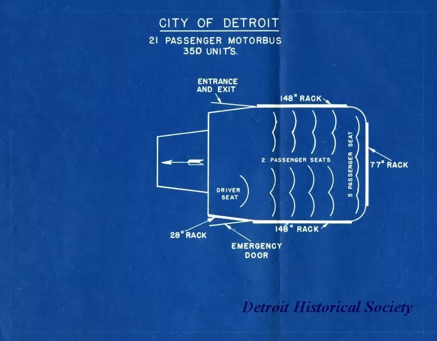 Blueprint of an interior plan view of a 21 passenger motorbus for the City of Detroit. The plan shows the entrance, emergency exit, the driver's seat, passenger seating, and the dimensions of rack space for advertising. The header also notes, "350 Units." "Printed by Jul 23, 1942, Economy Print Co." is stamped on the verso.