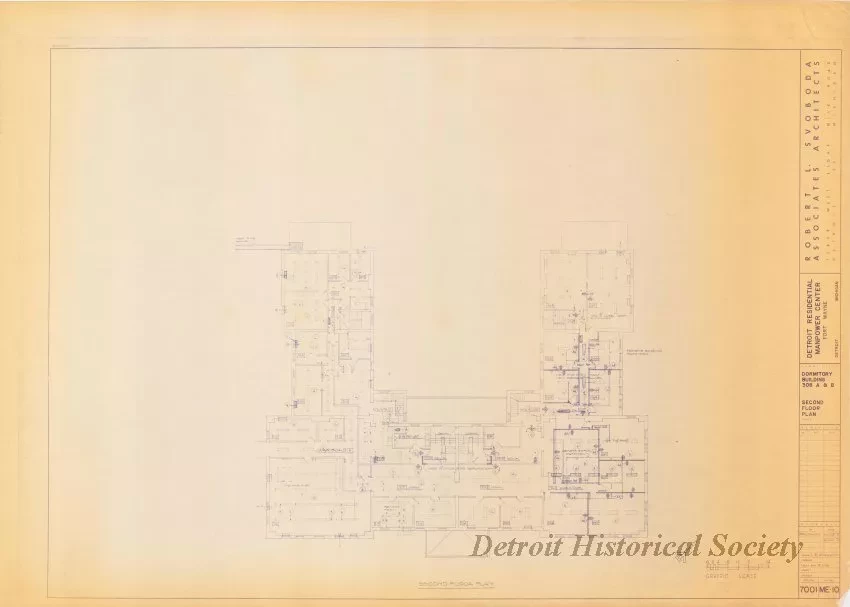 One blueprint drawing entitled "Detroit Residential Manpower Center, Fort Wayne, Detroit, Michigan." The drawing shows a floor plan of the second floor of Dormitory Building (No. 308A & B) at a scale of 1/8 inch = 1 foot. A title block along the right edge of the sheet shows that the plans were prepared by "Robert L. Svoboda Associates Architects, 13829 West Eight Mile Road, Detroit 35, Michigan," and shows a construction bid date of September 21, 1970. The project number is shown as "7001" and the plan sheet number is "ME-10."