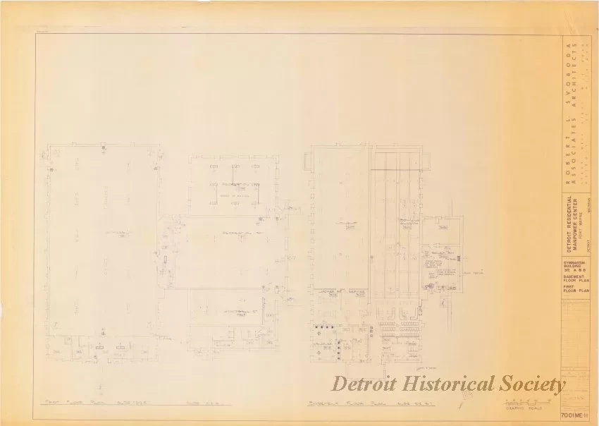 One blueprint drawing entitled "Detroit Residential Manpower Center, Fort Wayne, Detroit, Michigan." The drawing shows a floor plan of the basement and first floor of Gymnasium Building (No. 312A & B) at a scale of 1/8 inch = 1 foot. A title block along the right edge of the sheet shows that the plans were prepared by "Robert L. Svoboda Associates Architects, 13829 West Eight Mile Road, Detroit 35, Michigan," and shows a construction bid date of September 21, 1970. The project number is shown as "7001" and the plan sheet number is "ME-11."