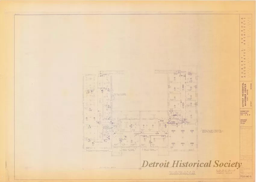 One blueprint drawing entitled "Detroit Residential Manpower Center, Fort Wayne, Detroit, Michigan." The drawing shows a plan view of the second floor of Dormitory Building (No. 314A & B) at a scale of 1/8 inch = 1 foot. A title block along the right edge of the sheet shows that the plans were prepared by "Robert L. Svoboda Associates Architects, 13829 West Eight Mile Road, Detroit 35, Michigan," and shows a construction bid date of September 21, 1970. The project number is shown as "7001" and the plan sheet number is "ME-15."