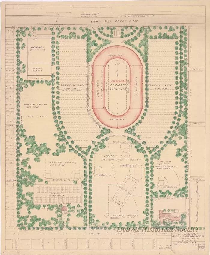 One blueprint drawing entitled "Farwell Field, 107.4 Acres - Stadium Site." The drawing shows the proposed layout of an Olympic stadium and parking areas on an existing recreational site that is bounded by Eight Mile Road on the north, Fenelon Avenue on the east, Outer Drive on the south, and Sunset Avenue on the west. The proposed stadium is shown in a red/brown color and trees are shown in green. Adjacent streets, property lines, lot numbers, and lot dimensions are also shown. The plan was prepared by the City of Detroit Department of Recreation at a scale of 1 inch = 100 feet and has a most recent revision date of November 19, 1954.