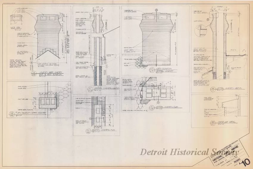 One blueprint titled "Historic Fort Wayne, Post Hospital Restoration." The blueprint (sheet A10) shows architectural details and construction notes for various brick chimneys on the hospital building. The title block in the lower right corner indicates that the plan was prepared by Charles Terrence McCafferty and Associates, Architects / Community Planners, and is dated 12 November 1979.