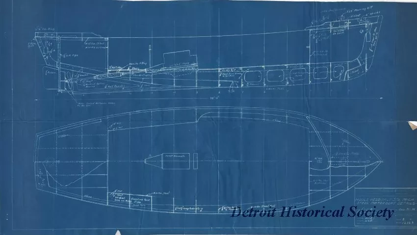 One blueprint drawing (sheet 3 of 4) entitled "Middle Neebish Light Station, Mich., Steel Motorboat Details." The drawing shows details and notes concerning structural elements of the hull and deck for the proposed boat. The title block indicates that the plan was prepared by the "Office of Superintendent of Lighthouses, Eleventh District, Detroit, Mich." It was drawn at a scale of 1 inch = 1 foot and is dated December 31, 1936.