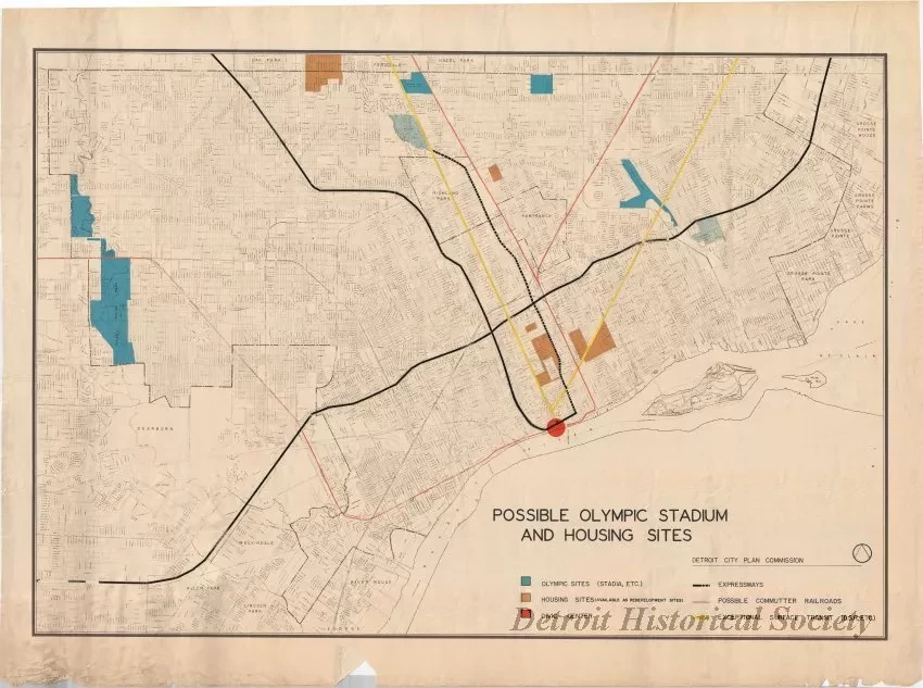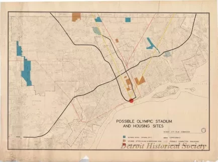 One blueprint street map of the City of Detroit entitled "Possible Olympic Stadium and Housing Sites." The shows colored lines and areas to indicate possible locations for Olympic facilities along with transportation links between these locations and downtown. The plan was prepared by the "Detroit City Plan Commission" and is undated.