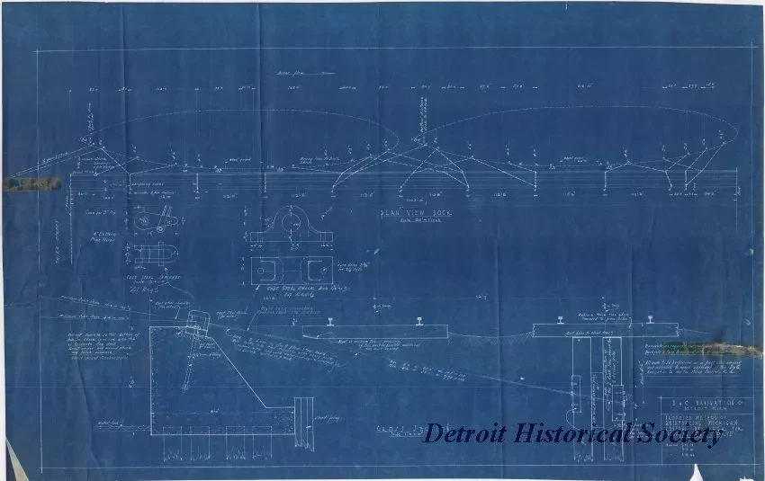 One blueprint drawing entitled "Proposed Method of Reinforcing Michigan Central Ry. [Railway] Dock for Mooring D&C Boats." The drawing shows plan and cross-section views of the Michigan Central Railroad dock along with the outlines of two vessels that are tied alongside the dock. The mooring line arrangements for the ships are also shown in relation to two parallel railroad track lines that run along the dock. In addition, the plan shows a series of underground cable anchorages that run beneath the railroad tracks in order to provide reinforcement for steel chocks at the edge of the dock which are the attachment points for the ships' mooring lines. The title block in the lower right corner shows that the drawing was prepared by the "D&C Navigation Co., Detroit, Michigan." The plan has a most recent revision date of March 13, 1941.