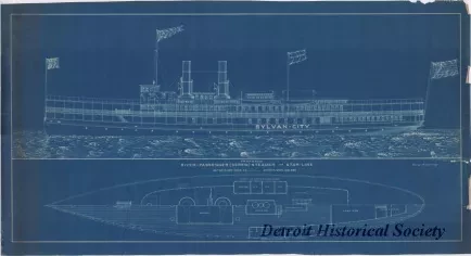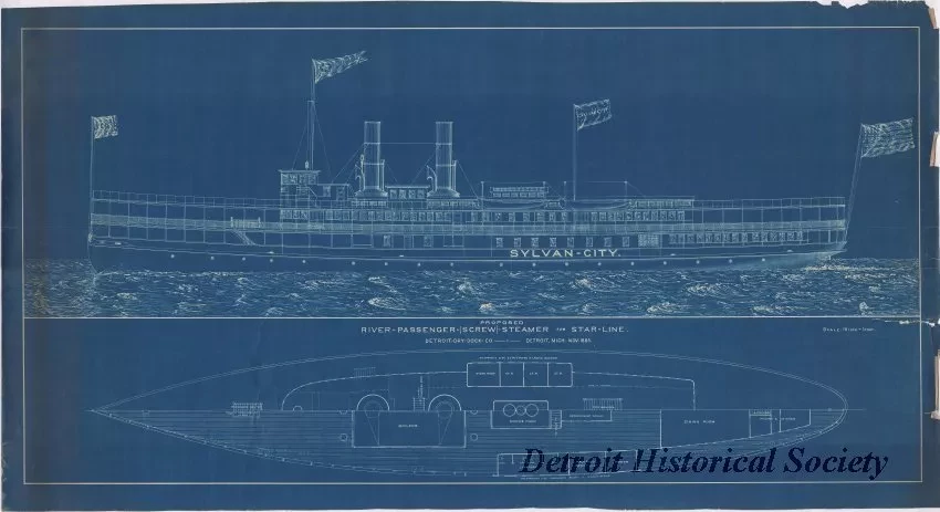 One blueprint drawing entitled, "Proposed River Passenger (Screw) Steamer Star Line." The drawing shows a port side exterior profile view and a main deck plan view of the proposed passenger steamship, Sylvan City. The title block shows that the drawing was prepared by the Detroit Dry Dock Company of Detroit, Michigan, at a scale of 1/8 inch = 1 foot. The plan is dated November, 1885.