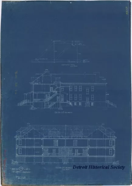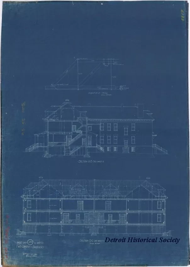 One blueprint drawing entitled "Two Company Barracks." The drawing (Sheet No. 2 of 12) shows two interior cross-section views of a three-story Barracks building at Fort Wayne. The drawing was prepared by "Claude J. Allen" of the Q.M.G.O. [Quarter Master General Office] at a scale of 1/8 inch = 1 foot and is dated January, 1893.