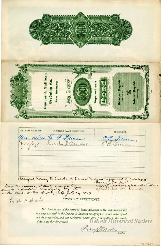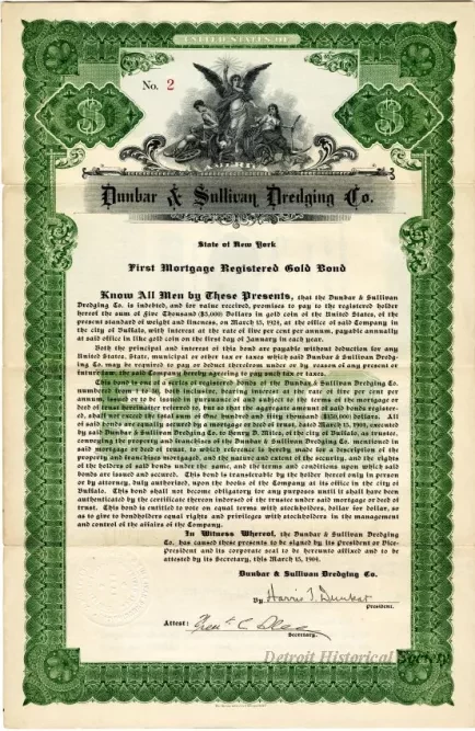 "Number 2, Dunbar & Sullivan Dredging Co. First Mortgage, 5 Per Cent, $5000 Registered Gold Bond" (2 of 30). The bond is printed in printed in red, green, and black ink on white paper that is watermarked "Broun-Green Beaver Bond." It has a decorative engraved green border with engraved images at the top that depict Lady Liberty and other figures that represent American industry and a bountiful harvest. Black, Old-English style text shows the company name, "Dunbar & Sullivan Dredging Co." and lists the terms of the bond issuance and repayment. The bond has been signed by "Harris T. Dunbar, President," and "Frederick C. Slee, Secretary," and is dated March 15, 1904. The 20-year bonds were due for repayment on March 15, 1924. A round, embossed company seal is located near the lower left corner of the bond. The verso contains blank spaces which have handwritten text that show the date and name in whom the bond was registered along with the signature of the company Treasurer. Other handwritten text and notes showed subsequent bond ownership reassignments with signatures.