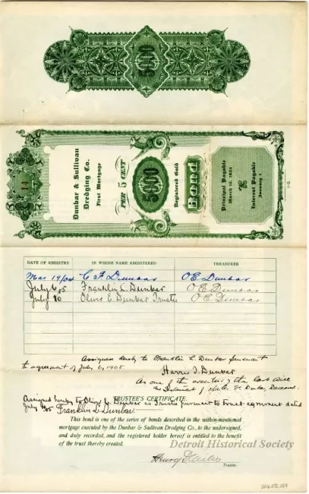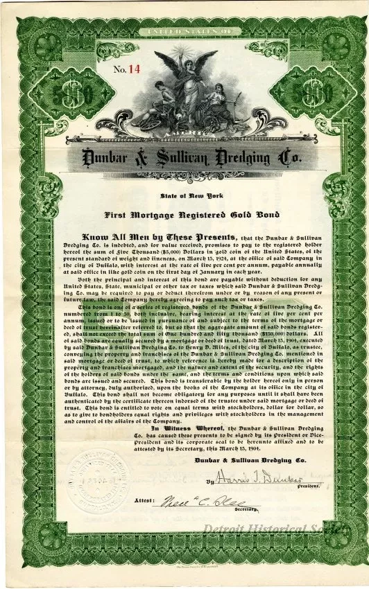 "Number 14, Dunbar & Sullivan Dredging Co. First Mortgage, 5 Per Cent, $5000 Registered Gold Bond" (14 of 30). The bond is printed in printed in red, green, and black ink on white paper that is watermarked "Broun-Green Beaver Bond." It has a decorative engraved green border with engraved images at the top that depict Lady Liberty and other figures that represent American industry and a bountiful harvest. Black, Old-English style text shows the company name, "Dunbar & Sullivan Dredging Co." and lists the terms of the bond issuance and repayment. The bond has been signed by "Harris T. Dunbar, President," and "Frederick C. Slee, Secretary," and is dated March 15, 1904. The 20-year bonds were due for repayment on March 15, 1924. A round, embossed company seal is located near the lower left corner of the bond. The verso contains blank spaces which have handwritten text that show the date and name in whom the bond was registered along with the signature of the company Treasurer. Other handwritten text and notes showed subsequent bond ownership reassignments with signatures.