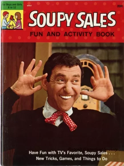 Soupy Sales activity book, printed by Treasure Books of New York, featuring a close up photo of Soupy doing "the Mouse" on the front cover. Within are coloring pages, projects, quizzes, mazes, and jokes centered around the television show and its characters.