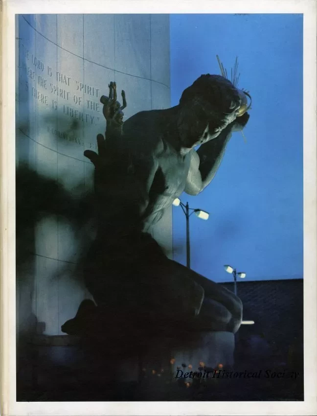 One book entitled "Detroit 1968, An Invitation to the International Olympic Committee to Celebrate the XIX Olympiad at Detroit, Michigan, U.S.A." The hardcover, oversize book is contained in a dark blue slipcase that has a red, white, and blue ribbon. The book has a picture of the Spirit of Detroit statue on the front cover and contains 42 un-numbered pages of black and white as well as color pictures which highlight the City of Detroit and the surrounding region. Explanatory text is printed in English and French. The back pages contain photocopies of letters of support from Governor George Romney, Mayor Jerome Cavanagh of Detroit, Mayor Michael Patrick of Windsor, and the Detroit Common Council along with a list of the Detroit Olympic Committee members.