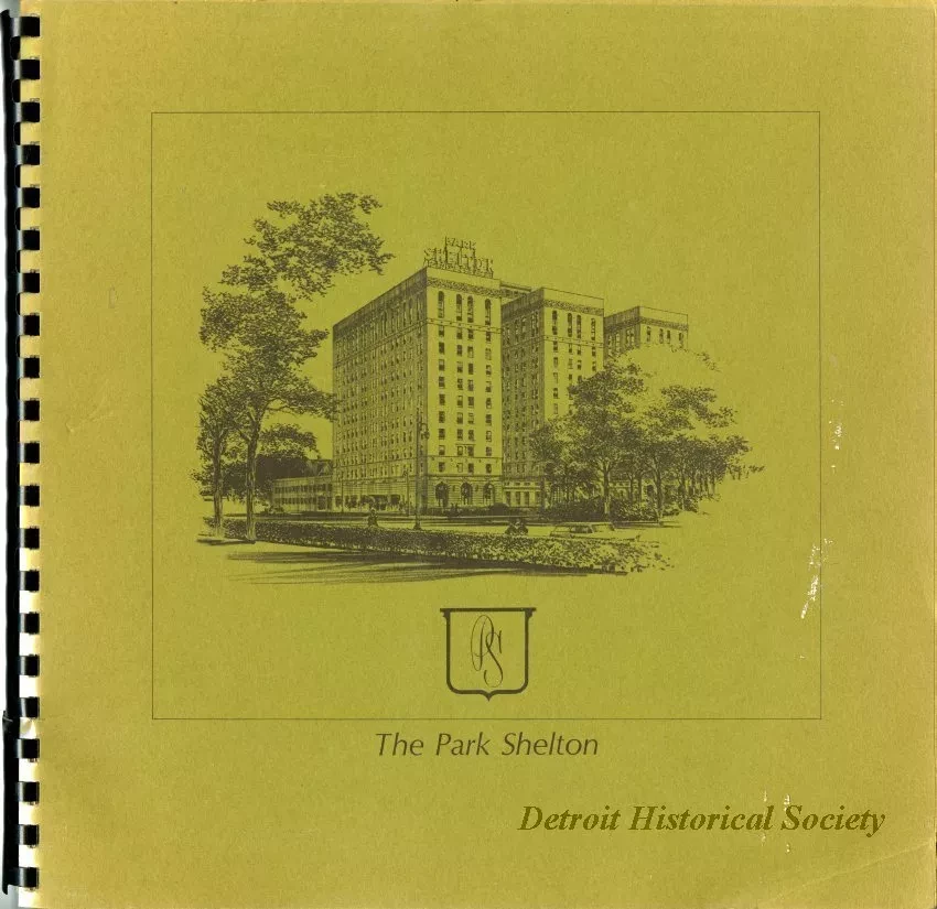 Book advertising the Park Shelton apartment, located at the corner of Woodward Avenue and Kirby Street. The book contains information about the Park Shelton, including drawings, floor plans, and information about the various types and sizes of apartments available. It also includes maps of the area and highlights local attractions in Detroit's Cultural Center, including the Detroit Historical Museum, the Detroit Public Library, and the Detroit Institute of Arts. The front and back covers of the book are made out of heavy green paper, with the front cover featuring an illustration of the Park Shelton. The book has a black spiral binding and its front and back covers are covered by a plastic sheet.