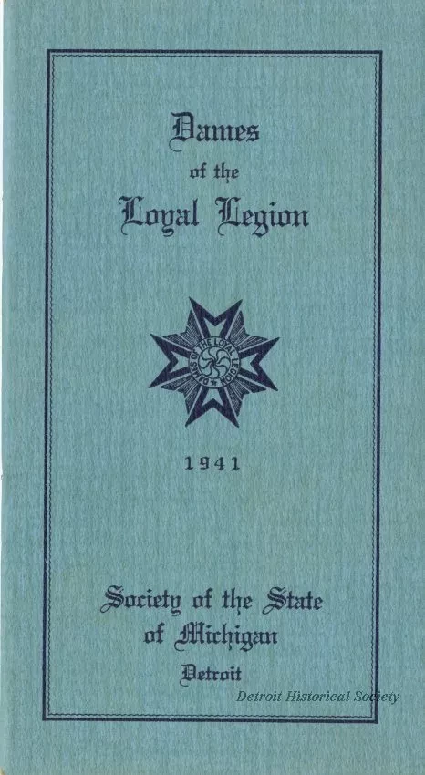 Booklet containing the by-laws, membership roster, and list of charter members of the Dames of the Loyal Legion Society of the State of Michigan, Detroit, for 1941. The booklet is staple-bound in a blue cover bearing the organization's name and seal. A "Mrs. James Vernor" is listed among the members.