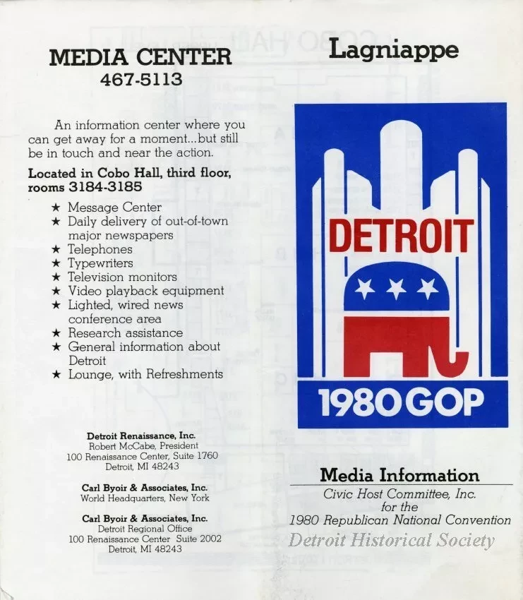 Booklet containing media information for the 1980 Republican National Convention, held in Detroit. The booklet was made by the Civic Host Committee for the 1980 Republican National Convention. The contents of the booklet maps of the city, brief histories of Detroit and the Republican Party in Michigan, listings of dining, cultural, recreational, and transportation resources, and a floor plan of the Cobo Hall Media Center.