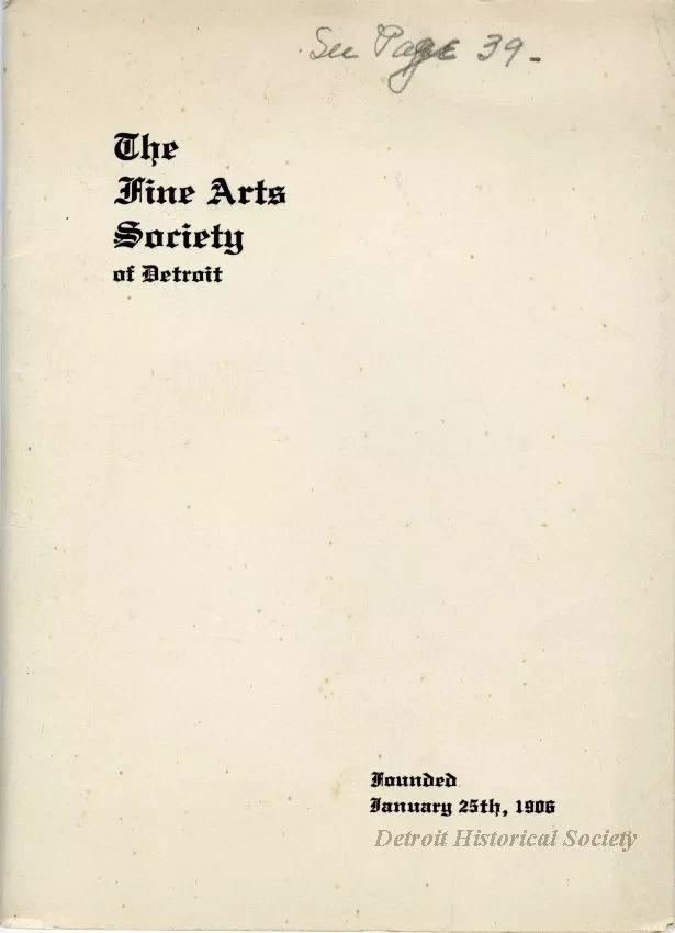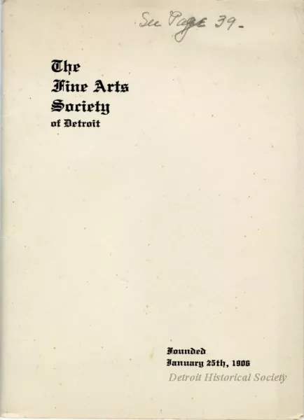 Booklet bound in a white cardstock cover with "The Fine Arts Society of Detroit, Founded January 25th, 1906," written in a blackletter typeface. The book's 52 pages contain lists of the society's officers from 1906 to 1935, a list of charter members, the 1935 roster, the articles of association, and the by-laws. A note in pencil on the cover refers to page 39, where another handwritten note is concerning the membership of Mr. and Mrs. C.A. Newcomb Jr., "Active in the early years--resigned & then at the instigation of Miss. H.B. Jay, Mr. again joined for 2 yrs--then resigned."
