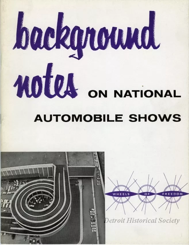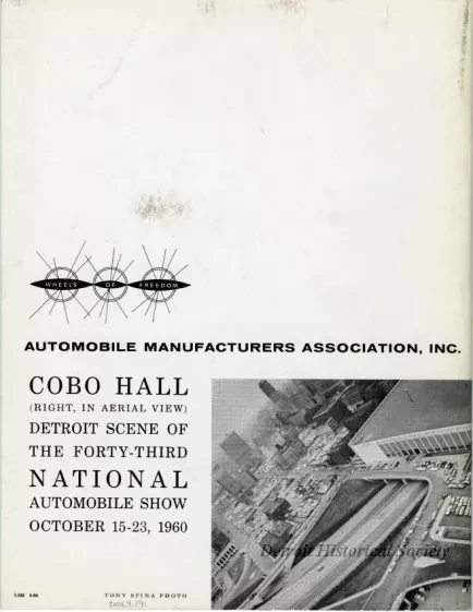 Booklet about the history of the National Automobile Show. A promotion for the 43rd show held at Cobo Hall, October 15-23, 1960. Cover photo by Tony Spina.
