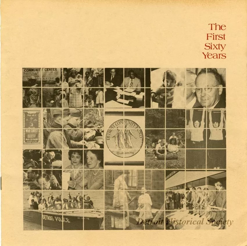 Booklet commemorating the first sixty years of United Community Services of Metropolitan Detroit tracing its history as the Detroit Community Union, Detroit Community Fund, Council of Social Agencies, War Chest, Community Chest, and the United Foundation with a time line, graphs, and numerous photos.