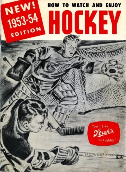 One softcover booklet entitled "How to Watch and Enjoy Hockey" which was published by the Stroh Brewery Company. The cover is made of heavyweight white paper that is printed with red and black title text and shows a drawing of two hockey players skating in front of a goal net. The booklet contains 21 pages of black printed text on white paper and gives an overview of how to play hockey as well as terminology and various play strategies. Diagrams are included with the text along with black and white photographic images of the Stroh Brewery Company. The back pages list various hockey records and show a schedule of NHL games for the 1953-1954 season.