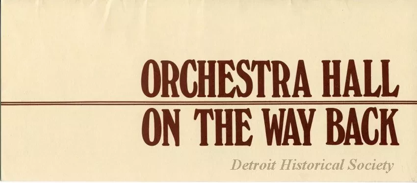 Booklet outlining the history of Orchestra Hall, concluding with its closing in 1951 and a phrase about the waiting for it to re-open; back says that "The Hall is saved from destruction," likely as a result of its being added to the National Register of Historic Places in 1971; calls for donations to become a member of Orchestra Hall; booklet is beige with brown ink and some illustration on the interior; front cover has text "Orchestra Hall - On the Way Back"; first and second part separated by two brown lines running between them horizontally