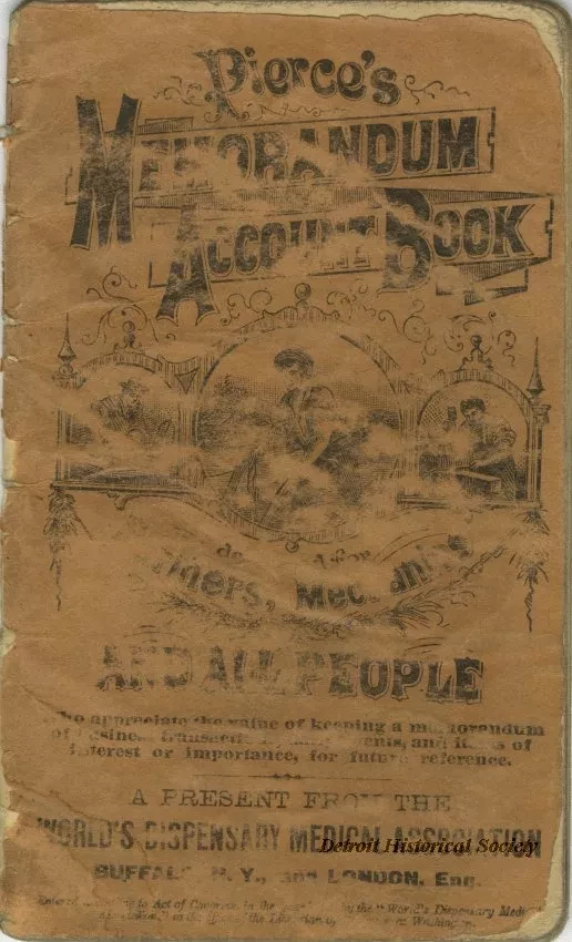 Pocket-sized date book published by the World's Dispensary Medical Association of Buffalo, New York and London, England. In addition to calendar for 1896 and 1897, and information about postage rates, this booklet includes lengthy passages about illnesses and medical conditions which serve as advertisements for the company's products. The pages for notes on January, February, and March have been filled with lists of names primarily of Germanic origin.