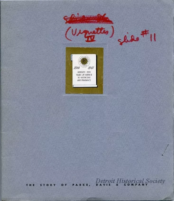 Booklet about the history of Parke, Davis & Co., commemorating its 75th anniversary. Includes black and white images and a map.