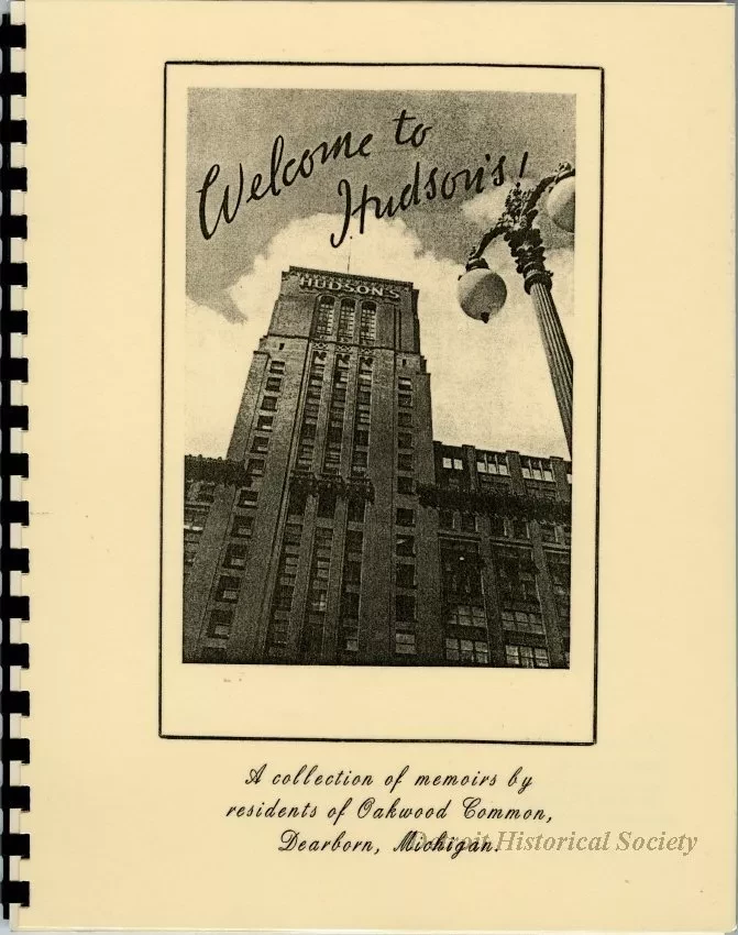 Comb-bound booklet containing twenty-seven accounts of the downtown Hudson's location as told by residents of the Oakwood Common Retirement Community, as well as a section of trivia about the store.